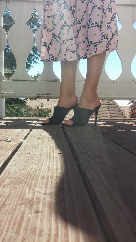 I always wore minis or maxis but I am thinking about the midi now, and love the styling here. Real steal on the mules!!